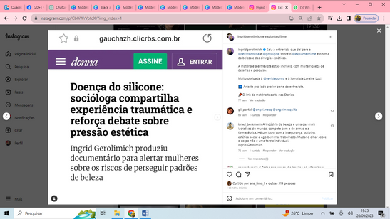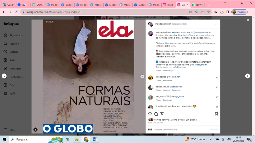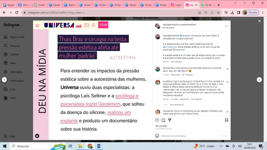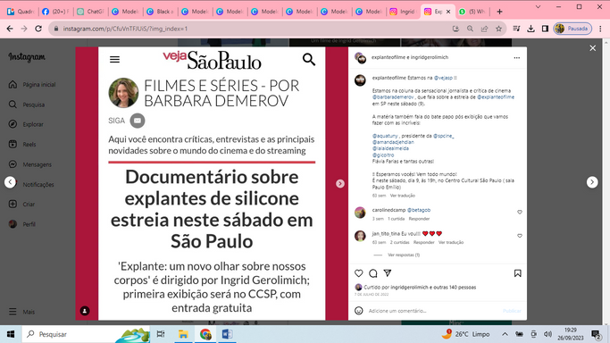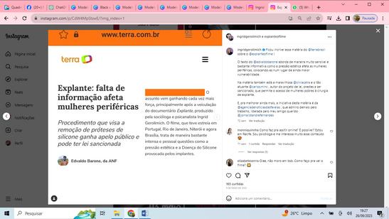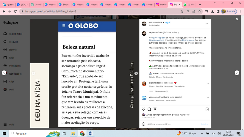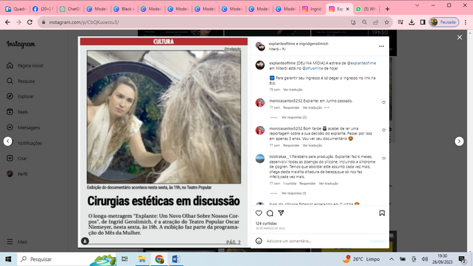 Ainda, criou e dirigiu o documentário Explante, com grande repercussão nacional. O filme levanta o debate sobre pressão estética e o impacto na saúde física e mental das mulheres.