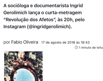 É autora e diretora do curta-metragem Revolução dos Afetos, que fala sobre o tema da solidão na contemporaneidade.
